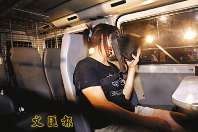 廣成街鋁窗墮街毀小巴,警方帶走一名婦人。
