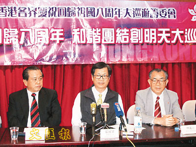 【本報訊】(記者 曾少妍)由19個民間團體發起,約800個團體合辦的「慶祝回歸八周年,和諧團結創明天」大巡遊,將於7月1日香港回歸紀念日舉行,預計有兩萬人參加。大巡遊籌委會主席鄭耀棠表示,大會口號是表達對和諧社會的追求,不會有政治性標語。對於有人於回歸日發起遊行,他表示,香港是多元化社會,各有不同訴求,相信參與巡遊及遊行的人士不會發生衝突。