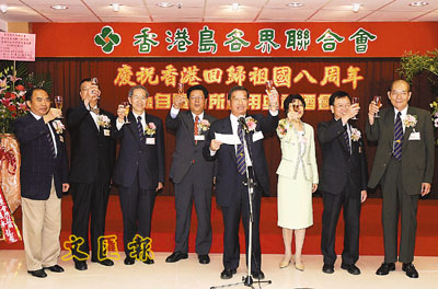港島各界聯合會會長黃守正致詞時表示,香港回歸祖國八年來,以董建華先生為首的特區政府,團結廣大市民,依照《基本法》,全面貫徹執行「一國兩制,港人治港」高度自治的方針,在中央政府支持下,克服了種種困難和挑戰,妥善處理了一系列政治、經濟和社會問題,使「一國兩制」在實踐中取得偉大成就,獲得了國際社會的高度評價。在中央政府和內地各省市大力支持下,隨著CEPA和「個人遊」的實施,一度陷入低谷的香港經濟開始強勁復甦,並持續穩步上升,市民對經濟前景信心增強,社會呈現自回歸以來最祥和的氣氛。