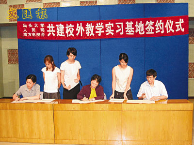 【本報訊】汕頭大學、人民網和南方電視台三方,於6月29日在汕頭大學舉行簽約儀式,共建校外媒體教學實習基地,他們認為,這是互惠互利,共創雙贏。