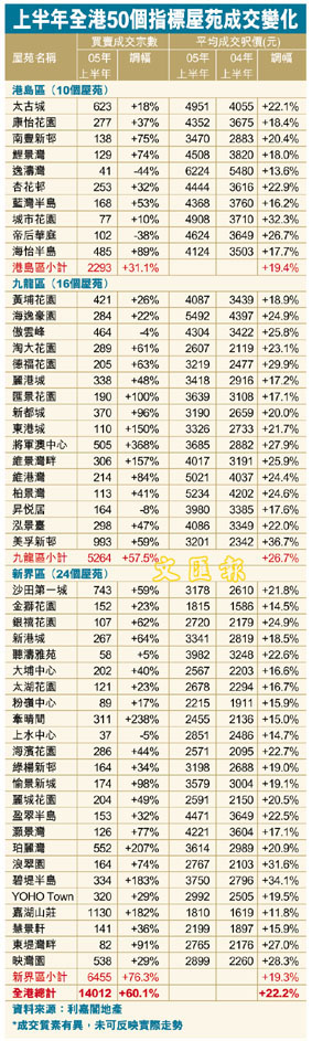 [2005-07-01] 上半年全港50個指標屋苑成交變化