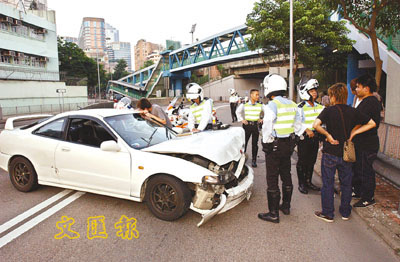 涉嫌醉酒駕駛青年姓林(19歲),昨清晨5時許,林駕駛私家車載同一名女伴,尾隨友人座駕沿界限街向觀塘行駛,馳至101號對開時,林報稱因為閃避一輛切線的士,失控掃毀左邊3米鐵欄後撞向石壆,車頭毀爛,車上兩人幸無受傷,前車數友立即停車協助,其他駕駛人士發現報案。