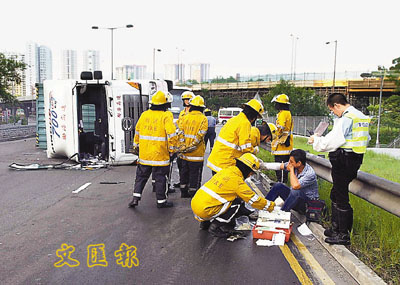 櫃車翻側司機僅輕傷 (圖)