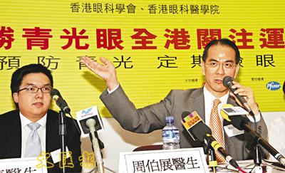眼科專科醫生周伯展表示,近年愈來愈多人患上近視,以致青光眼的患者增加。「超過600度便算深近視,遠視超過300度亦要小心,度數愈高,併發症便愈嚴重。」他又說,患有糖尿病、偏頭痛及高血壓等均是青光眼的高危一族,建議40歲以上的人士每年定期驗眼,而由於3至7歲的小朋友的眼部發育尚未穩定,亦要定期驗眼。