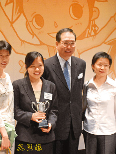 李國章希望陳日君能心平氣和。在其旁持獎杯的為謝卓君。 張曉恩 攝