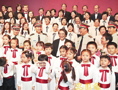 【本報訊】(記者 葉傲冬)「大刀向鬼子們的頭上砍去!殺!」激昂的歌聲中,香港藝術合唱團和花兒朵朵兒童合唱團,昨日與駐軍一起,度過了一個愉快的下午。為慶祝抗戰勝利60周年,兩個合唱團的成員到昂船洲軍營作慰問表演,期間高歌多首耳熟能詳的名曲,最後更與駐港部隊合唱《大刀進行曲》和《歌唱祖國》。