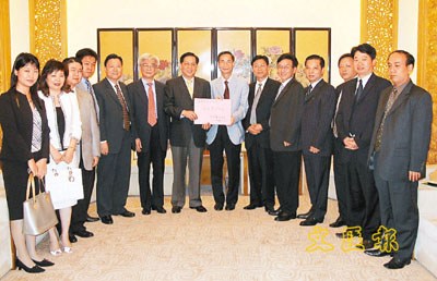 ■吳良好(左七)等將善款交到黎桂康手中,由中聯辦轉交到福建省。 沈清麗 攝
