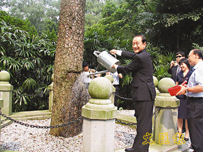 ■郁慕明澆灌當年孫中山親手栽種的松樹。 梁茹 攝