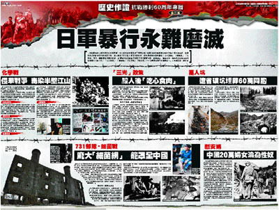 和德國納粹一樣兇殘的日本法西斯,在二戰中給中國造成了深重災難。德國納粹的奧斯威辛集中營被人類永遠銘記,德國為自己的戰爭罪行向世界下跪;而一樣犯下滔天反人類罪行的日本,卻在歷史教科書中刪去「三光政策」、「細菌戰」、「化學戰」罪行。翻開歷史沉重的記錄,日軍對中華民族犯下的滔天罪行歷歷在目,鐵證如山,豈容日本一些無恥之徒肆意妄為地推翻?!「萬人坑」、「三光政策」、「細菌戰」、「化學戰」、「慰安婦」——日軍侵華暴行永難磨滅。