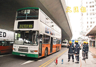 【本報訊】一輛行走美孚至灣仔碼頭905號線新巴,在行至干諾道西時,司機發現座位背後電箱冒煙,於是立即停車並疏散車上乘客。消防員接報到場,用滅火筒將火救熄,初步懷疑是電線短路引起火警,無人受傷。 溫瑞麟 攝