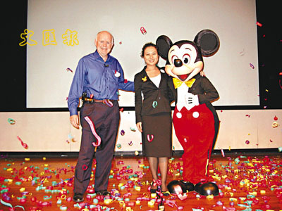 杜苡樂成為迪士尼樂園親善大使,獲得香港迪士尼樂園集團行政總裁羅彬深及米奇老鼠的祝賀。 Angela提供