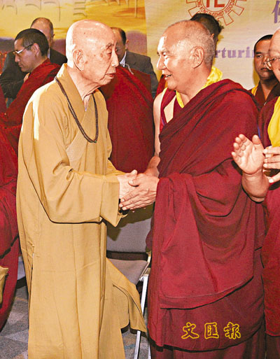 西藏文化周座談會上,覺光長老及西納活佛(右)親切地握手。 劉國權 攝