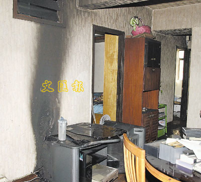 ■單位內牆壁熏黑,旁邊的電視機也被焚燬。