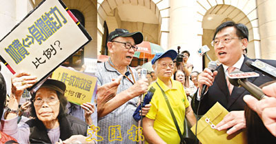 ■一批長者擔心醫療改革會增加收費,昨在立法會門外請願,周一嶽在接收示威人士的請願信時強調,政府不會放棄任何病人,沒有錢都會照顧,也不會因為看病而導致破產。 羅蘭蓉 攝