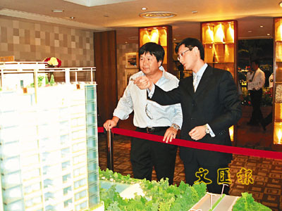 玩具大王蔡志明(左)昨日參觀畢架山峰示範單位,信和韓家輝親自介紹。 周穎 攝