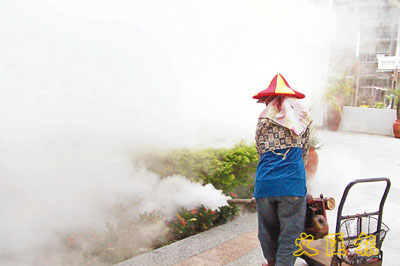海棠颱風侵襲與西南氣流影響,高雄縣17日晚上起大雨不斷,各鄉鎮淹水嚴重,縣府23日全面噴藥消毒,也籲請民眾清除室內外積水,防止登革熱疫情。 中央社