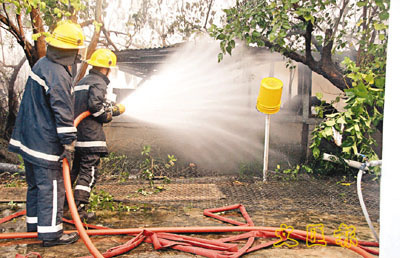 【本報訊】高埔村一間被用作儲物的鋅鐵木屋,昨午疑電線短路起火,消防員須從錦田路接駁近2百米消防喉救火。由於火勢猛烈,消防員將鄰近20多名居民疏散。火警在一小時後被救熄,無人受傷。