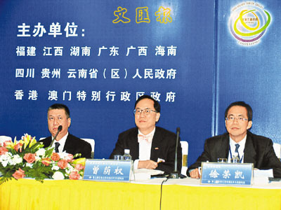 ■香港特首曾蔭權、澳門特首何厚鏵(左)和雲南省省長徐榮凱(右)25日出席泛珠論壇記者招待會。 中新社