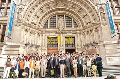 ■25日,中國首發英國旅遊團成員們在倫敦的維多利亞.阿爾伯特博物館前合影。 新華社