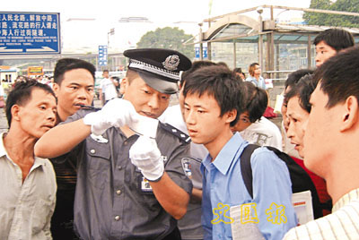 進入暑運以來,廣州火車站的每日客流量為10萬人次,為確保暑運安全,廣州鐵路警察在火車站教旅客識別假票。 中新社