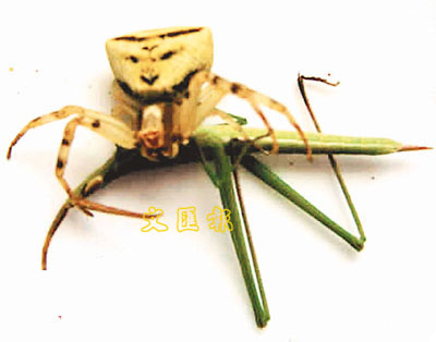 據了解,這隻「人面蜘蛛」通體淺黃色,8隻腳呈透明狀。令人稱奇的是,其背上長著一張臉,眼睛、嘴角十分清晰,乍一看就像一張少女的笑臉。據捕捉這隻「人面蜘蛛」的人介紹,牠行動極為敏捷,胃口極好,每天要吃三四隻螞蚱。其笑臉很可能藏有劇毒,螞蚱經其一咬,幾秒鐘內就會死亡,4分鐘內便被吮吸得只剩下一個空殼了。