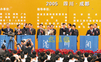 ■行政長官曾蔭權、何厚鏵、四川省省委書記張學忠與多個省區負責人主持第二屆泛珠洽談會開幕儀式。