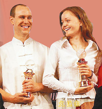 ■7月22日,第四「漢語橋」世界大學生中文比賽一等獎獲得者俄國姑娘安娜及美國小伙子布萊恩在北京領獎。新華社