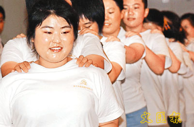 南京「胖胖夏令營」的小營員們在形體室裡揮汗如雨,刻苦減肥。15名不同年齡的小胖墩們將進行10天全封閉的減肥訓練,努力實現健美夢想。新華社