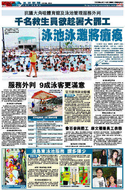 【本報訊】(記者 羅敬文 潘曉平)港九拯溺員工會計劃下周一(8月1日)一如往年「爆大鑊」,發動千人罷工,抗議政府外判泳池管理服務,料全港泳池和泳灘將陷癱瘓。政府消息人士表示,正與醫療輔助隊、香港拯溺總會、游泳教師協會和業餘游泳總會磋商,以提供合資格救生員作緊急支援,但由於罷工日是上班日,難以提供足夠人手應付,料全港泳館和泳灘只能局部開放。