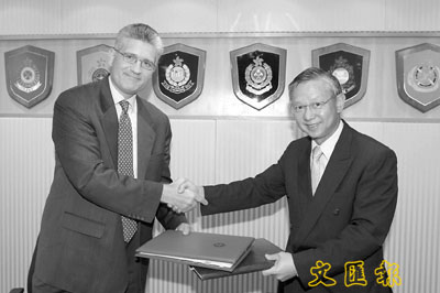 保安局局長李少光(右)昨日代表香港特別行政區政府,與代表以色列國政府的以色列總領事Mr Eli Avidar(左)交換刑事事宜相互法律協助協定的文本。