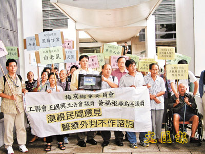 立法會議員王國興及離島區議員黃福根,昨與20多名梅窩居民到美利大廈示威,抗議政府在計劃外判診所前沒有進行諮詢。 梁偉雄 攝