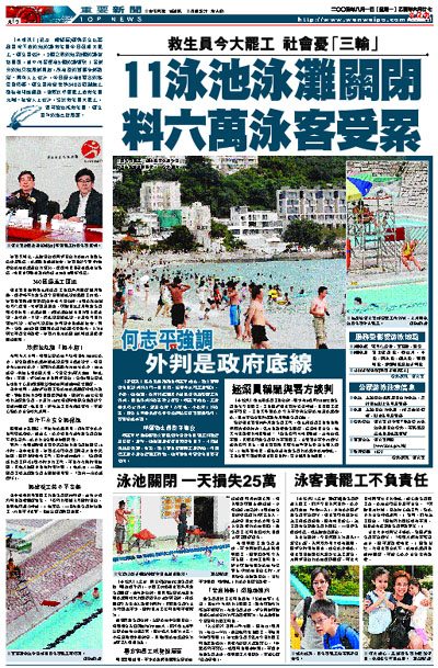【本報訊】(記者 潘頌禧)康樂及文化事務署轄下的泳池泳灘救生員今日發起大罷工。康文署估計,3個公眾泳池及8個泳灘被迫關閉,其中南區便有5個泳灘遭殃;另部分泳池只能局部開放,所有習泳班要全部取消。業內人士估計,今日最少有6萬名泳客受到影響。康文署將會安排340名拯溺義工維持有限度服務,並再次呼籲罷工的救生員克制。社會人士估計,這次救生員大罷工,很可能造成救生員、康文署和泳客三輸局面。