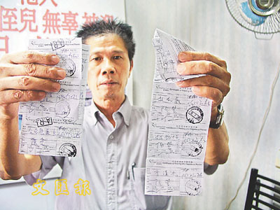 死者伯父卓先生展示寄往陸豐市公安局的掛號信收條。陳朗昇 攝