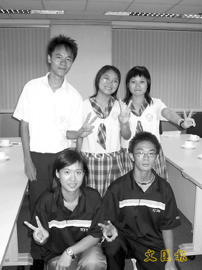 前排左起︰仁濟醫院董之英中學學生鄭凱琳、彭煒堅。後排左起︰廠商會蔡章閣中學的羅偉文、梁慧婷、鄧葭惠。 曾媚 攝