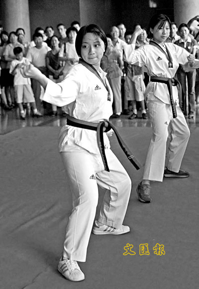 第四屆內地香港少年手拉手體驗交流營在西安舉行。來自香港的40多名營員將在陝西省進行歷時7天的體驗交流活動,使內地、香港的少年兒童通過共同活動、相互交流,獲得真情感悟與真誠友誼。圖為兩名香港少年在交流營表演跆拳道。新華社圖片