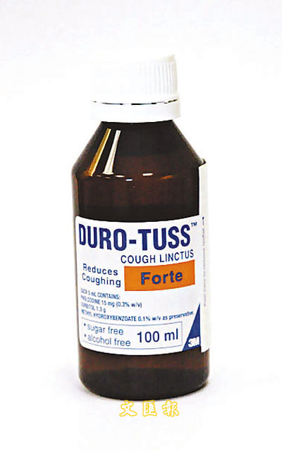 【本報訊】一款名為「Duro-tuss」(見圖)的止咳露,疑發生錯誤包裝,80瓶濃度較高的藥液被放進標示藥力較低的包裝盒內出售。由於該款止咳露含有嗎口林乙基嗎啡,可令服用者神志不清及呼吸困難,衛生署呼籲購入該款止咳露的市民留意,而入口商正回收有問題的產品。