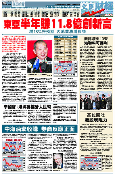 至於入股內地銀行的進度,李國寶稱,希望下半年有好消息公布。陳棋昌又稱,東亞目前除擁有一大批商業客戶外,近期亦開始於內地拓展個人財富管理業務,此均對銀行的利息及非利息收入帶來貢獻。