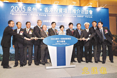 2005泉州.香港投資項目推介洽談會在港舉行,泉州市委書記鄭道溪(左六),代市長朱明(左八)與香港特區工商及科技局常任秘書長俞宗怡(左七)及嘉賓主持開幕禮。 張偉民 攝