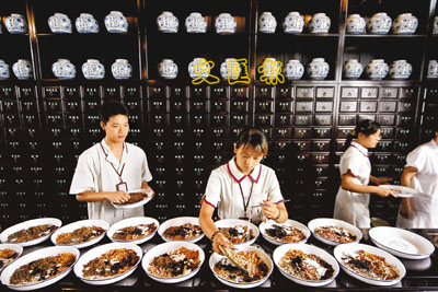 ■4日,國醫館古色古香的中藥房內,藥劑師正在精心抓藥。當日,杭州具有兩百多年歷史的文物建築「梁宅」修繕後以「廣興堂國醫館」的面貌重新迎客。醫館引進國家級、省級名中醫坐堂,為眾多前來求醫問藥的市民把脈開方。新華社