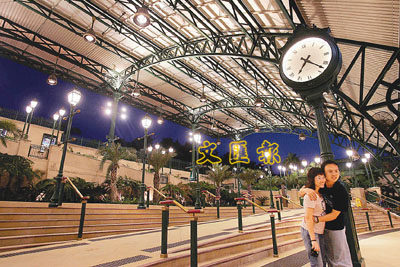 地鐵迪士尼站開放後,吸引大批市民前往參觀,圖為一對情侶在懷舊車站前合照。右為一群小朋友目睹卡通人物噴泉,禁不住歡呼雀躍。 路透社