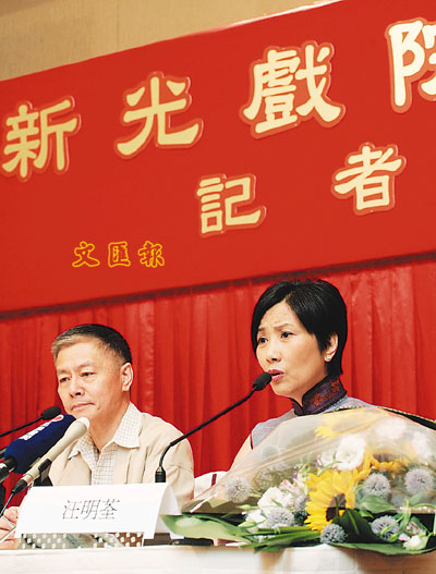 汪明荃和阮兆輝在記者招待會上強烈要求設立永久劇院,並呼籲粵劇界團結,持續向港府爭取。潘達文 攝