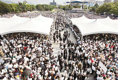 日本廣島市周六舉行原爆60周年紀念活動,全球數以萬計人齊集這個首遭原子彈襲擊的城市,要求全球廢除核武。日本眾議長致詞稱,廣島原爆紀念提醒日本不能復辟軍國主義,而日本首相小泉純一郎則遭反戰分子喝倒彩。