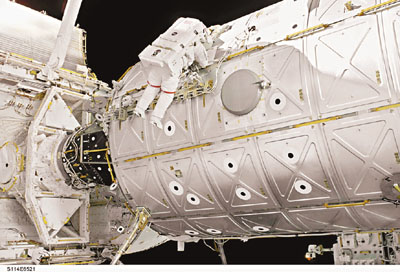 ■太空人野口聰一於第三次太空漫步期間在國際太空站命運號實驗艙外漫步。美聯社