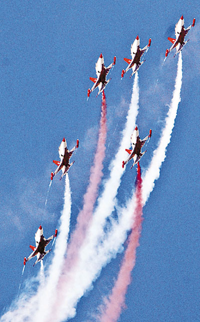 6日,匈牙利的凱奇凱梅特城,舉行每年一度的飛機檢閱,有17個國家共71架飛機參與,圖為土耳其國家代表隊。 美聯社