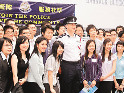 一哥艷福不淺!昨天幾十名大學生參觀學警結業禮後,和李明逵合照,未知當中有幾多人想成為一哥手下? 陳朗昇 攝
