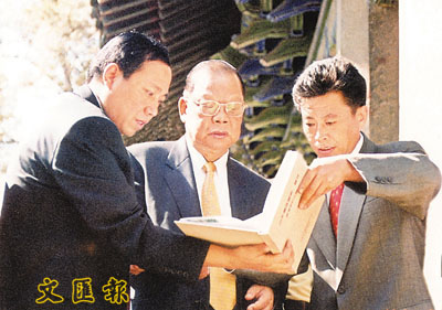 ■嘉祥縣委書記周洪(左)向曾憲梓匯報維修方案。資料圖片