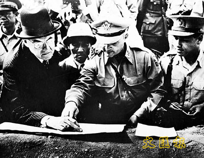 1950年6月17日,美國國務卿杜勒斯到三八線策劃侵朝戰爭。左起:杜勒斯、韓國李承晚政府國防部長申性模、美國軍事顧問團準將羅勃特、韓國李承晚政府陸軍參謀長丁一權。
