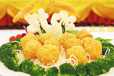 保留傳統粵菜特色,加入創新元素。金黃色的蝦球襯上碧綠的西蘭花,配以潔白的粉絲墊底,看上去雍容華貴、色澤分明,食起來香脆爽口、酥而不膩。
