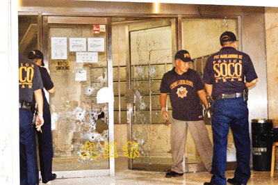 ■菲律賓華裔男童被綁架案,現場大廈玻璃門彈痕纍纍。菲商報提供