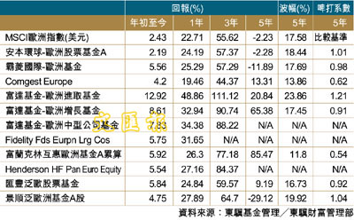 另外,Comgest Europe及富蘭克林互惠歐洲基金就較適合保守的投資者,兩者的波幅相對同類基金為低,分別為13.31%及11.8%。Comgest Europe以價值投資法選股,並看好歐洲的健康護理業。長線而言,富蘭克林互惠歐洲基金的表現不俗,過往5年的回報達85%,適合喜歡「放長線釣大魚的讀者」。